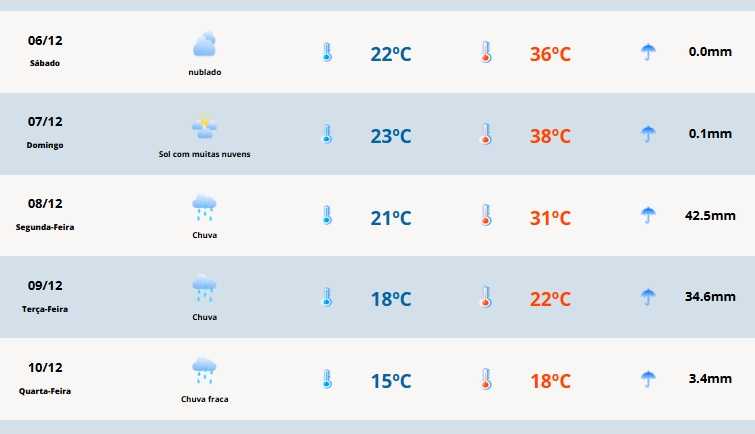 Em Cerro Largo as temperaturas oscilam entre 22°C e 36°C neste sábado. Já no domingo, a máxima pode chegar aos 38°C.