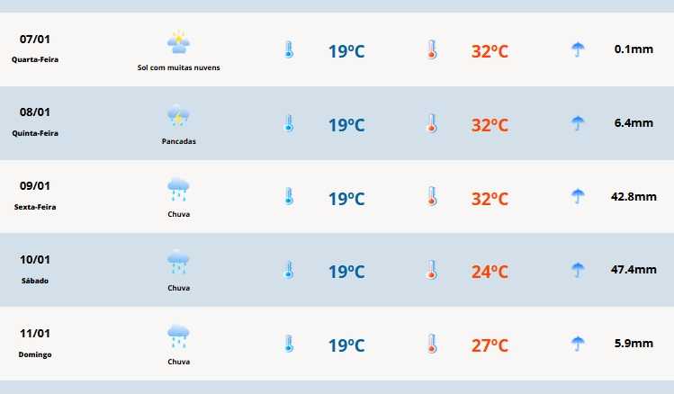 Em Cerro Largo, as temperaturas variam entre 19°C e 32°C.