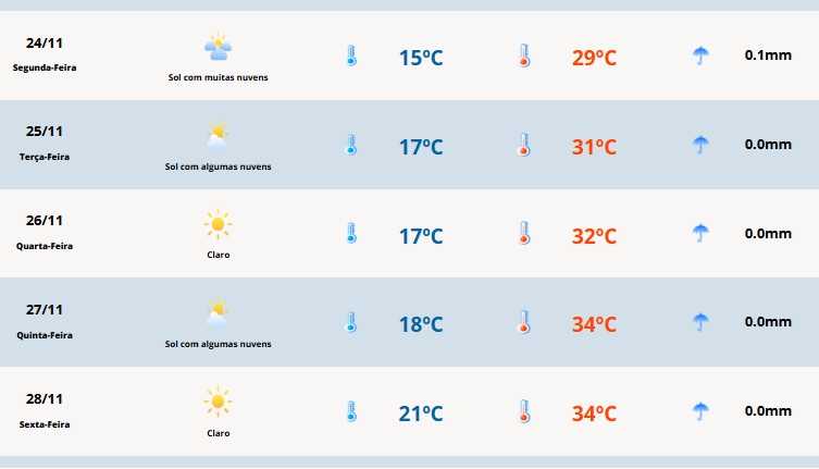 Em Cerro Largo a temperatura mínima será de 15°C e a máxima de 29°C.