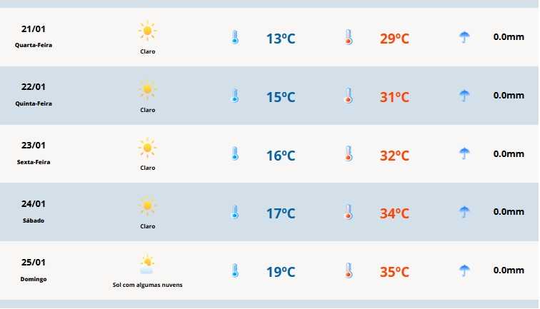 Em Cerro Largo, a temperatura mínima será de 13°C e a máxima de 29°C. Em Ausentes e em Vacaria as mínimas serão de 9ºC e as máximas 19ºC e 23ºC, respectivamente. Em Santa Rosa a temperatura oscila entre 13ºC e 30ºC e em Porto Alegre fica entre 16ºC e 27ºC.