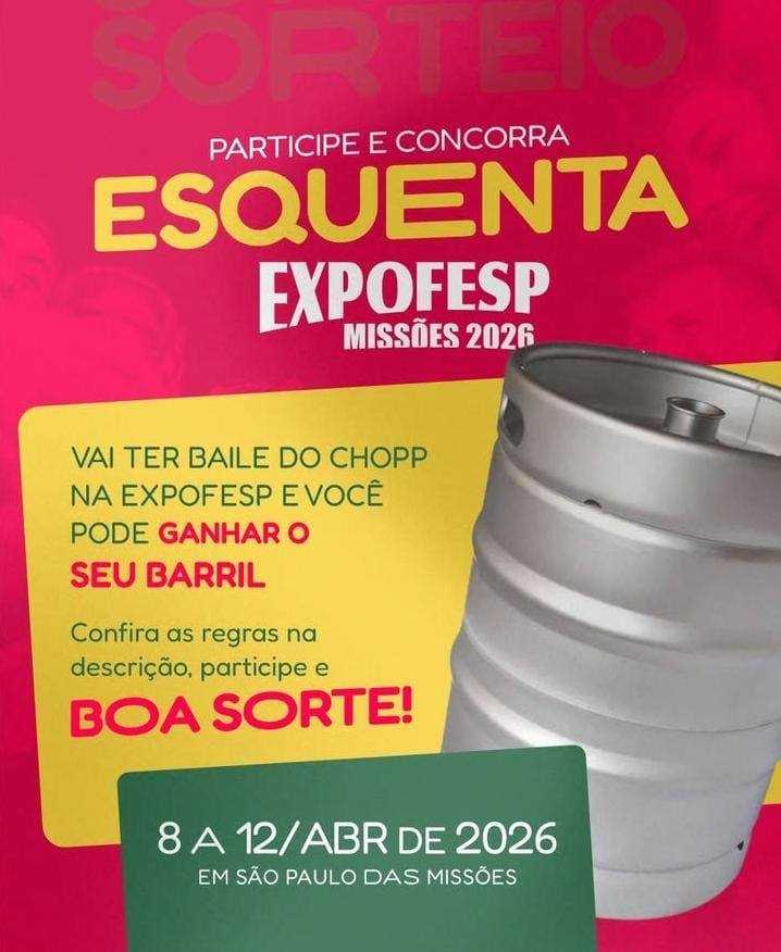 Sorteio de 01 barril de chopp de 30 litros - No dia 11/04 acontecerá Baile de Chopp animado pelas bandas Garotos do Som e Musical San Francisco. Para esse baile, a Expofesp está realizando nas suas redes sociais uma promoção onde o espectador segue as instruções e pode ganhar um barril de 30 litros que vai ser sorteado entre os participantes da promoção no dia 02/04, em sorteio pelas redes sociais.