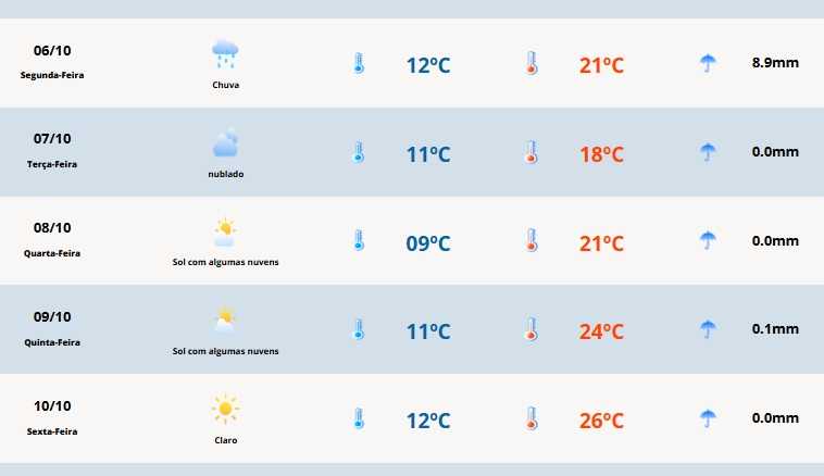 Em Cerro Largo, a mínima será de 12°C. Já a máxima pode chegar a 21°C.