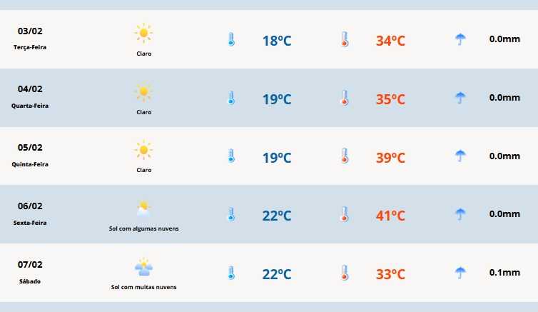 Em Cerro Largo, as temperaturas variam entre 18°C e 34°C. Em Uruguaiana, as marcas oscilam entre 23ºC e 38ºC enquanto em Alegrete ficam entre 22º e 36ºC. Já em Capão da Canoa os termômetros terão registros de 21ºC a 31ºC. Em Porto Alegre as temperaturas variam entre 21ºC e 34ºC.
