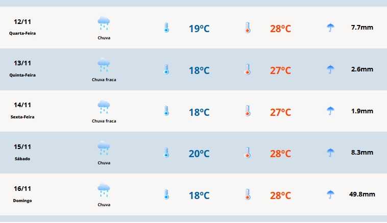 Em Cerro Largo, há possibilidade de pancadas de chuva, com a temperatura oscilando entre 19°C e 28°C.