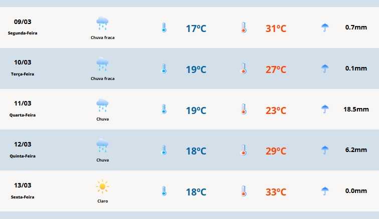 Em Cerro Largo, a temperatura varia entre 17°C e 31°C.