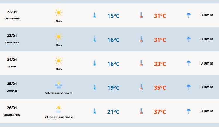 Em Cerro Largo, a temperatura mínima é de 15°C e a máxima de 31°C.