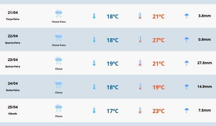 A chuva ocorre de forma irregular, com grande variação nos volumes. Isoladamente, espera-se até possibilidade de trovoadas em algumas regiões. Em Porto Alegre, o dia alterna entre sol e nuvens, tem períodos de céu nublado e não afasta a instabilidade.