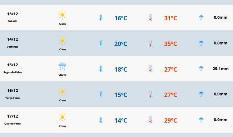 Em Cerro Largo a temperatura mínima será de 16°C e a máxima de 30°C. Em Porto Alegre, a temperatura oscila entre 20ºC e 33ºC e em Capão da Canoa entre 19ºC e 30ºC. Em Ausentes as marcas variam entre 10ºC e 25ºC e em Santa Cruz de 16ºC a 33ºC. Já em Uruguaiana os termômetros terão registros entre 19ºC e 34ºC e em Erechim entre 15ºC e 30ºC.