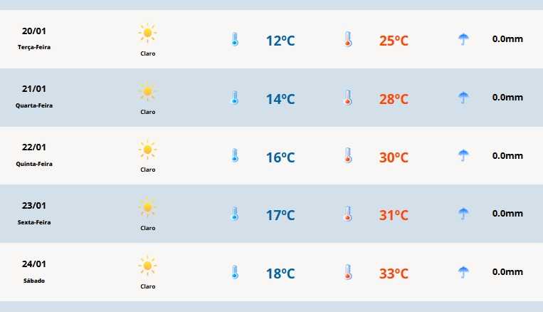 Em Cerro Largo, a temperatura mínima será de 12°C e a máxima de 25°C. Em Ausentes, as marcas oscilam entre 6ºC e 21ºC e em Vacaria entre 8ºC e 23ºC. Em Bagé, os termômetros terão registros entre 10ºC e 26ºC, enquanto em Porto Alegre varia entre 16ºC e 27ºC.