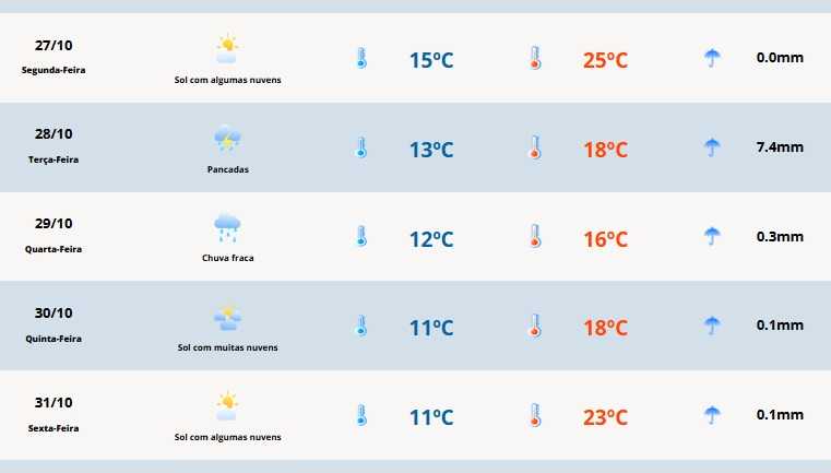 Em Cerro Largo, a temperatura mínima será de 15ºC e a máxima, de 25ºC.