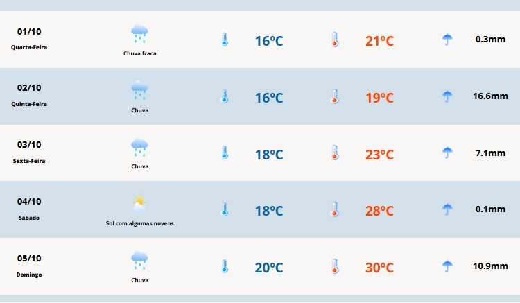 No Chuí, a temperatura varia entre 11ºC e 21ºC. Em Caxias do Sul as marcas variam de 15ºC a 20ºC, enquanto Santa Rosa fica entre 17ºC e 26ºC. Já em Bagé, a mínima será de 10ºC e a máxima de 22ºC.