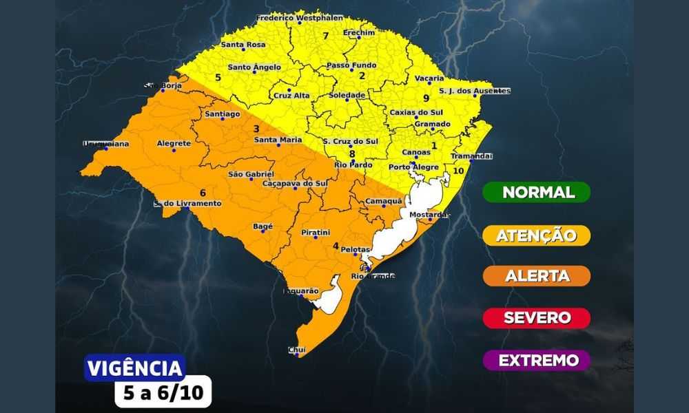 Entre a tarde e a noite do domingo (05), o deslocamento de uma frente fria provoca tempestades com granizo grande, rajadas de vento entre 70 e 90 km/h, com potencial para ultrapassar os 100 km/h, descargas elétricas e chuva forte nas regiões Oeste, Campanha e Sul. Os acumulados variam entre 30 e 80 mm/dia. Os temporais iniciam pelas áreas da Campanha, Sul e Oeste, indo em direção ao Centro, Noroeste e Missões no decorrer da noite. Na região Sul, algumas tempestades podem também ocorrer na manhã de domingo, com potencial de rajadas de vento de até 90 km/h.