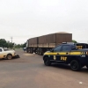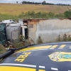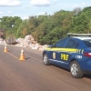 Sacos de arroz ficam espalhados na BR 285, após quebrar tampa lateral de carreta