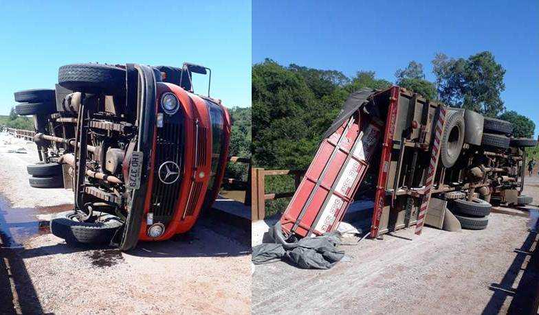 Um caminhão Mercedes Benz, com placas de Pejuçara (RS), tombou em cima da ponte, interrompendo o tráfego naquele local, enquanto o veículo - que transitava no sentido Cerro Largo / Campina das Missões - não for retirado.