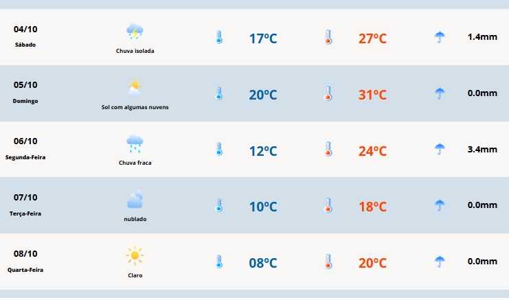 Em Cerro Largo, a temperatura mínima será de 17°C e a máxima de 27°C.