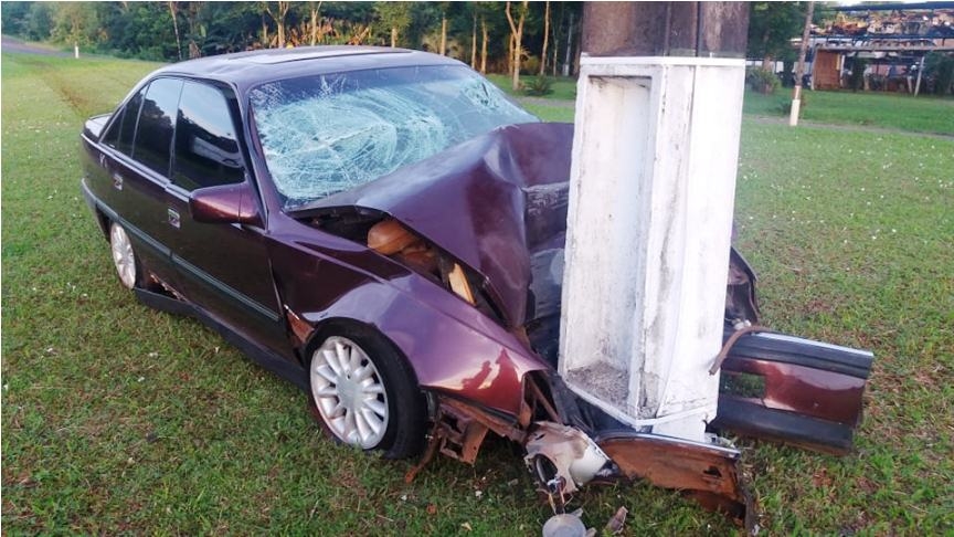 Um GM Ômega GLS, cor bordô, que transitava no sentido Salvador das Missões/Cerro Largo, entrou reto pelo canteiro do trevo e bateu violentamente contra um poste de iluminação pública, ficando com a parte frontal destruída.