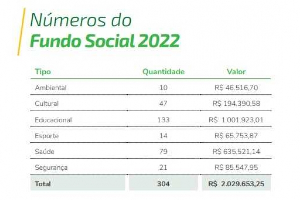 Neste ano, foram ao todo 304 projetos, sendo dez projetos ambientais, 14 esportivos, 21 projetos de segurança, 47 culturais, 79 projetos de saúde e 133 projetos voltados à educação.