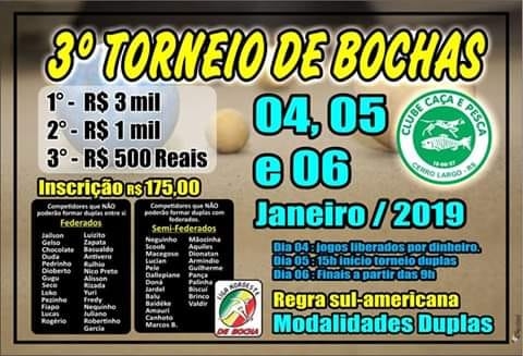 Nos dias 4, 5 e 6 de janeiro de 2019, o Clube Caça e Pesca de Cerro Largo estará realizando mais um grande evento esportivo, o 3º Torneio de Bocha, com um total de R$ 4,5 mil em prêmios.