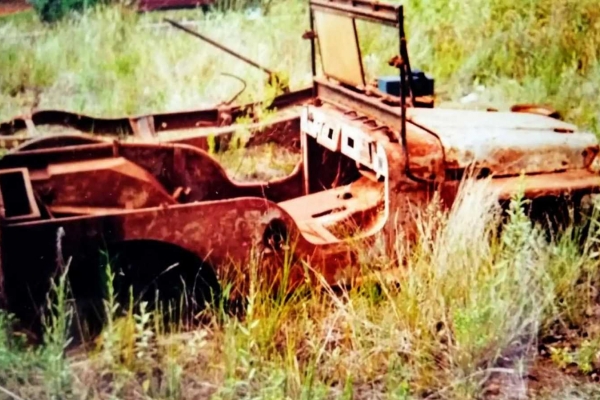 O que havia era um escombro sem motor nem câmbio, mas com chassi completo, os dois eixos e os feixes de molas na frente e atrás. A carroceria (já sem grade) estava toda coberta por uma camada superficial de oxidação e não havia qualquer traço de sua pintura original.