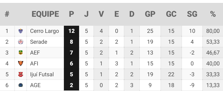 Na classificação geral - que envolve os 23 clubes participantes - a liderança é do Ibira (Ibiraiaras) e da ASF (Serafina Corrêa), com 13 pontos; vindo logo atrás o XV de Novembro (Vila Maria) e o Cerro Largo Futsal/Lojas Becker, com 12 pontos. E na quinta colocação aparece o Pelotas, também com 12 pontos (mas com uma partida a menos), único time com 100% de aproveitamento até o momento.