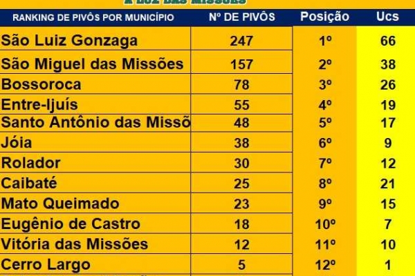 O município com o maior número de pivôs centrais atendidos pela Cermissões, é São Luiz Gonzaga, com 247, seguido por São Miguel das Missões, com 157.