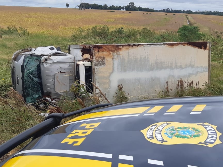 Por volta das 12h30min desta terça-feira (16), a Polícia Rodoviária Federal (PRF) foi acionada para deslocar ao Km 409 da BR 472, em São Borja, onde um caminhão havia capotado fora da pista.