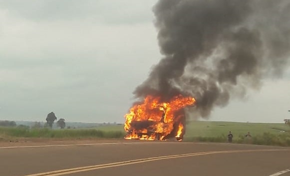 Na altura do pórtico de entrada da cidade de Miraguaí, o motorista sentiu um cheiro forte de combustivel e 200 metros após conseguiu estacionar o veículo, já em chamas.