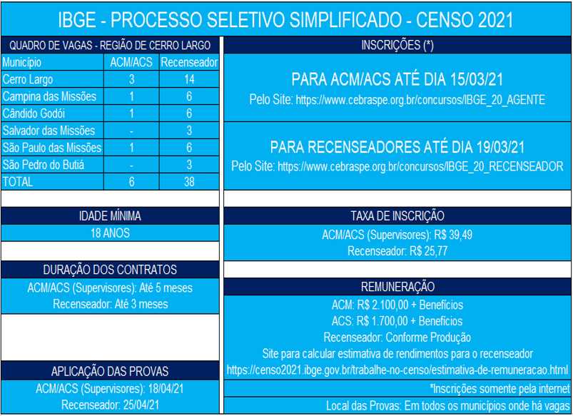 Já para as vagas de recenseador, as inscrições começaram no dia 23 de fevereiro e vão até 19 de março. A taxa de inscrição é R$ 25,77 e a inscrição também pode ser feita pelo site do Cebraspe (clique AQUI).