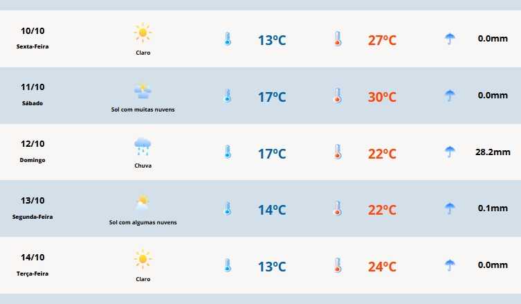 Segundo a MetSul Meteorologia, a sexta-feira (10/10) será de muito sol e amplos períodos de céu claro. Porém, nuvens aparecem em algumas regiões no decorrer do dia, como no Litoral Norte, Serra e no Sul do estado. O prognóstico indica que faz menos frio cedo e muitas cidades vão amanhecer com marcas amenas. Contudo, aquece mais à tarde e pontos do vales, Oeste e Noroeste registrarão máximas ao redor de 30ºC.