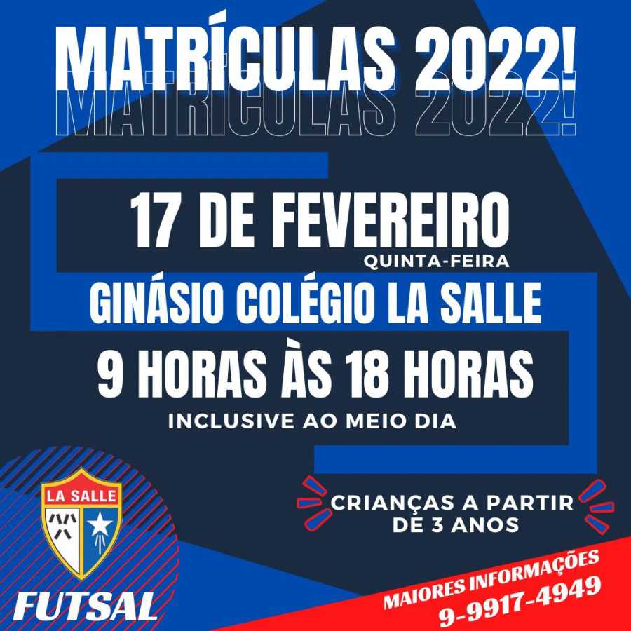 As matrículas para a Escolinha Futsal La Salle ocorrerão nesta quinta-feira (17/2), das 9h às 18h (inclusive ao meio-dia), no ginásio do Colégio La Salle Medianeira.