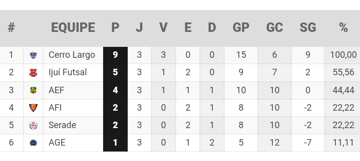 O Cerro Largo Futsal/Lojas Becker, que marcou 15 gols e sofreu 6, com saldo positivo de 9.