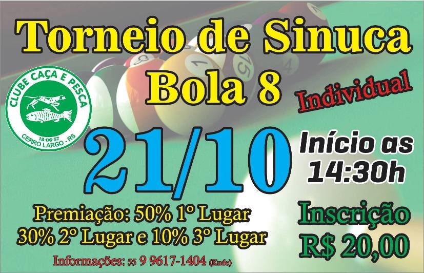 Neste domingo (21), o Clube Caça e Pesca de Cerro Largo sedia um Torneio de Sinuca Bola 8, na modalidade individual.