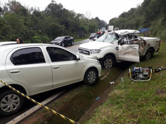 A colisão, que ocorreu por volta das 11h15min de hoje (8), envolveu um veículo Toyota Etios de Teutônia, uma camionete Ford Ranger de Nova Candelária e uma carreta de Santo Cristo.