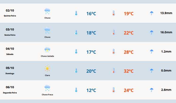 Nestes locais, os acumulados variam entre 20 e 60 mm/dia. As temperaturas mínimas oscilam entre 12°C e 19°C, e as máximas entre 20°C e 29°C.