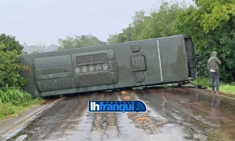 Na manhã desta quarta-feira (10/12), um ônibus do Exército Brasileiro tombou na rodovia RS 168, próximo ao trevo de acesso a Roque Gonzales! O acidente aconteceu por volta das 10h20min.