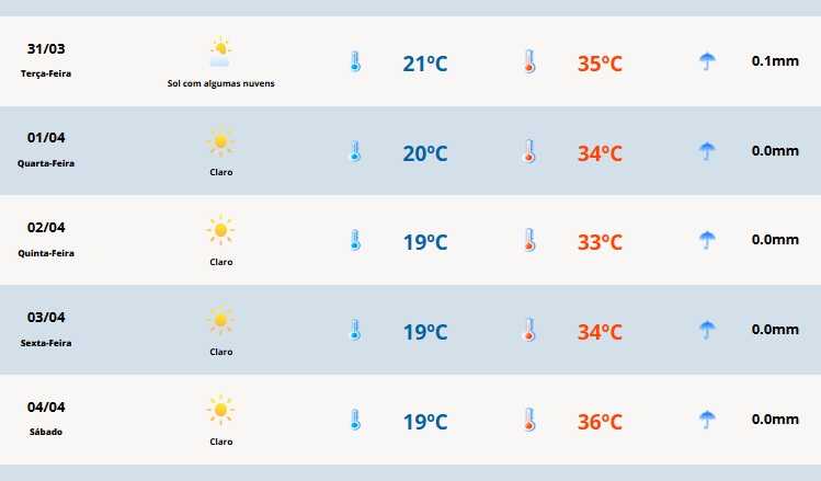 A atuação de uma massa de ar quente mantém as temperaturas elevadas neste último dia de março, com calor intenso na Metade Oeste. Já na Metade Leste, os termômetros ficam mais amenos, embora o dia ainda seja quente.