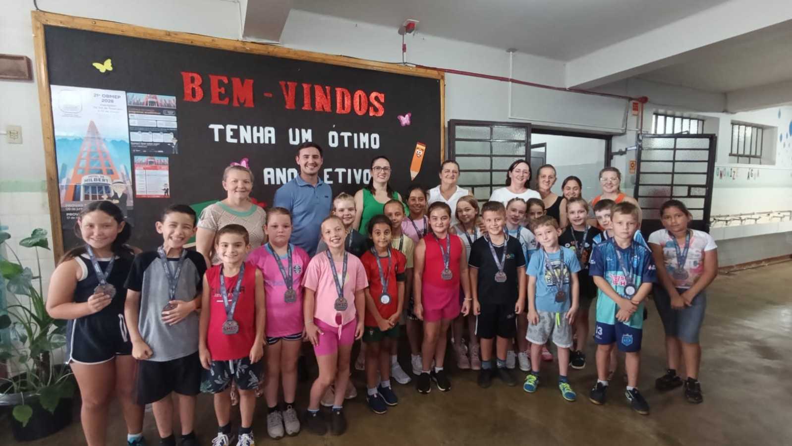 No dia 02 de março, o Município celebrou a entrega de medalhas aos alunos Leitores Fluentes do programa Alfabetiza Tchê, em reconhecimento aos expressivos resultados alcançados na Avaliação de Saída 2025.