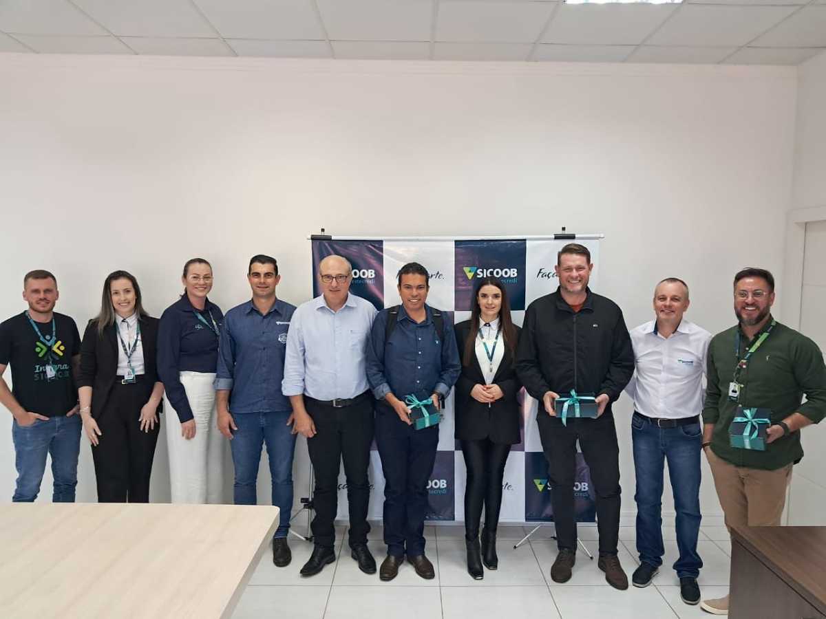O Sicoob Oestecredi reuniu sua alta gestão — o presidente Vanderli Soprano e os diretores Lilian Spengler, Gelson Roos e Eliana Berlt — juntamente com a gerente de crédito e o coordenador do crédito rural, em um encontro com representantes do Centro Cooperativo Sicoob (CCS) e da Central SC/RS/PR.