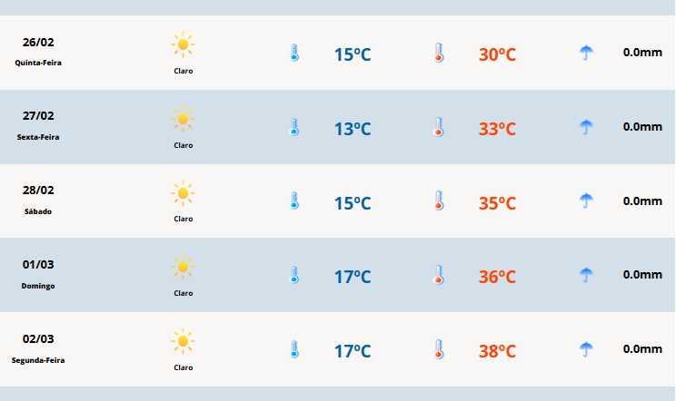 Em Cerro Largo, as temperaturas variam entre 15°C e 30°C.