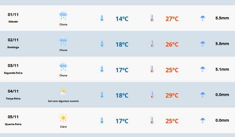 Em Cerro Largo, a mínima prevista será de 14°C e a máxima de 27°C. Aquece mais no Noroeste do estado, onde não se afasta chuva isolada no final do sábado.