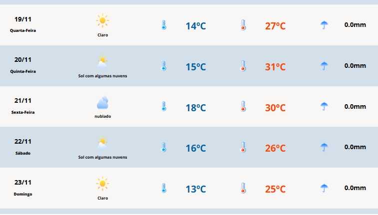 Em Porto Alegre a temperatura oscila entre 16ºC e 27ºC e em Caxias do Sul fica entre 13ºC 23ºC. Já em Ausentes, a mínima será de 8ºC e a máxima de 20ºC. Em Alegrete as marcas variam de 16ºC a 30ºC e em Cerro Largo de 14ºC a 27ºC.