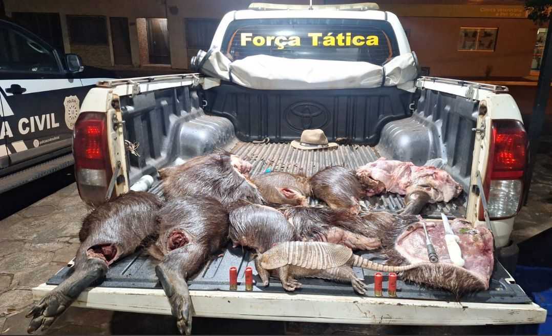 Foram apreendidos carne de capivara e tatu, além de quatro munições CBC calibre 12