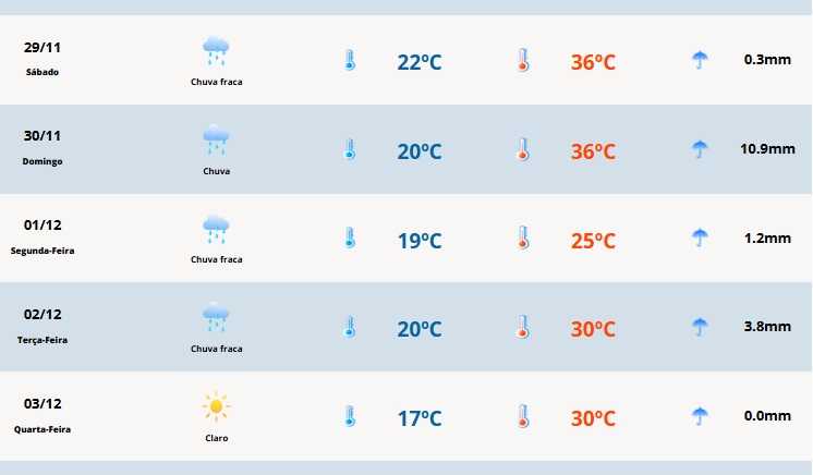 Em Porto Alegre, as temperaturas ficam entre 20°C e 30°C. Em Cerro Largo, os termômetros marcam entre 22°C e 36°C.