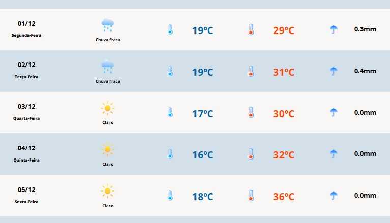 Em Cerro Largo, a temperatura mínima será de 19°C e a máxima de 29°C.