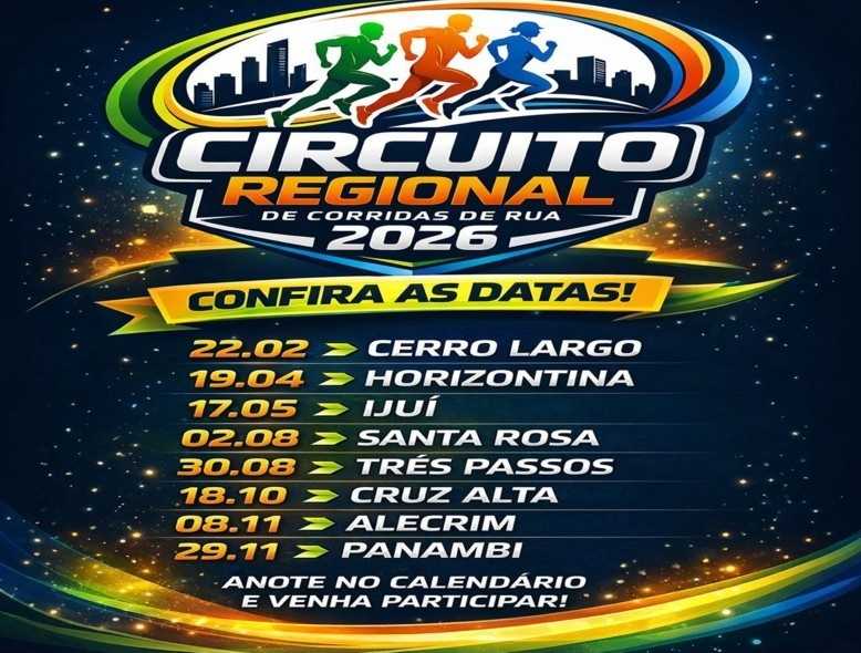 Cerro Largo sedia - em 22 de fevereiro - a etapa de abertura do 13º Circuito Regional de Corridas de Rua, competição que terá ao longo de 2026 a realização de oito provas: Cerro Largo (22/02), Horizontina (19/04), Ijuí (17/05), Santa Rosa (02/08), Três Passos (30/08), Cruz Alta (18/10), Alecrim (08/11) e Panambi (29/11).