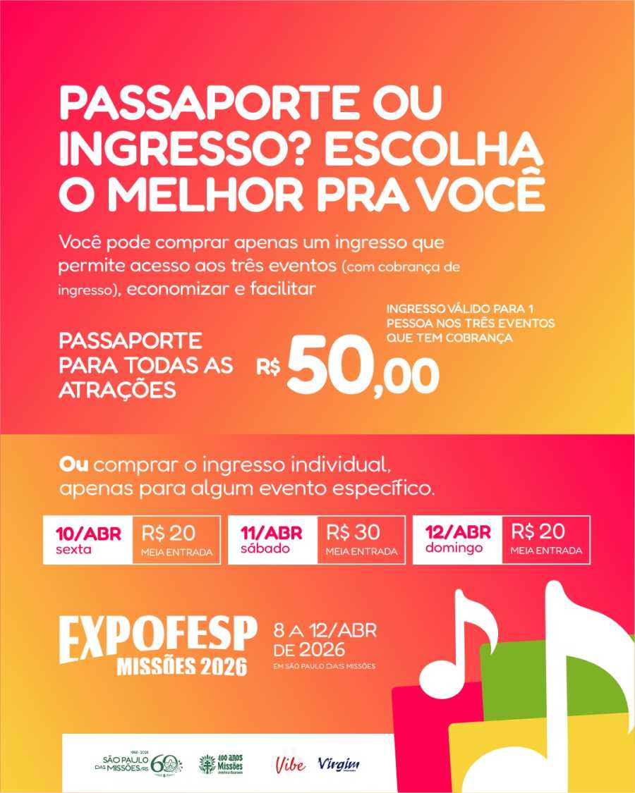 A Comissão da 14ª Expofesp Missões com o findar do lote de passaportes disponíveis, resolve ampliar o lote para comercialização com o início das vendas físicas. Confira os pontos de vendas e formas de adquirir seu passaporte ou ingressos individuais.