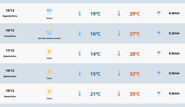 Em Cerro Largo, a temperatura mínima será de 19°C e a máxima de 29°C.