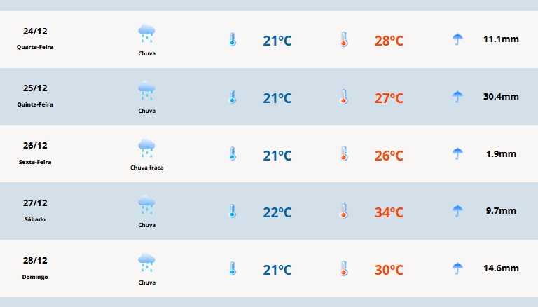 Em Cerro Largo a temperatura mínima será de 23°C e a máxima de 28°C. Em Porto Alegre, varia entre 24ºC e 31ºC e em Caxias do Sul entre 20ºC e 27ºC. Já em Capão da Canoa e em Torres as marcas oscilam entre 23ºC e 29ºC. Em Santiago, os termômetros terão registros de 22ºC a 32ºC.