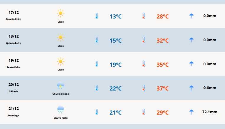 Em Cerro Largo, a temperatura mínima será de 13°C e a máxima de 28°C.