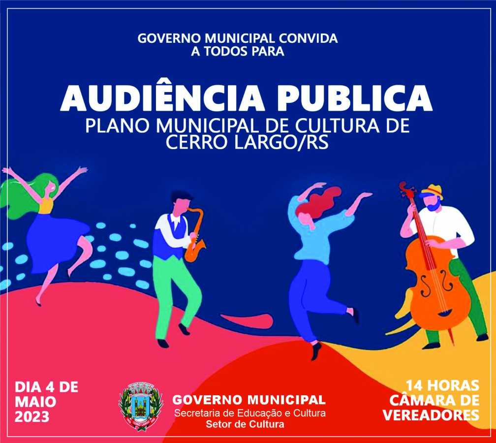 No próximo dia 4 de maio (quinta-feira), a partir das 14h, acontece uma Audiência Pública para debater o Plano Municipal de Cultura, tendo como local a Câmara de Vereaadores de Cerro Largo.